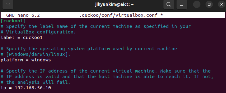 생성한 샌드박스 cuckoo1의 설정 확인 및 ip 수정.